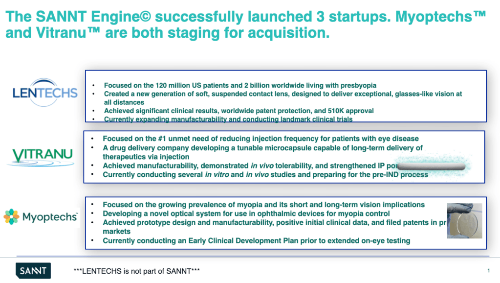 SANNT’s business model focuses on creating portfolio companies around eye care technologies and selling these companies to strategic multinational global eye care companies, creating a consistent cadence of liquidity events over time.